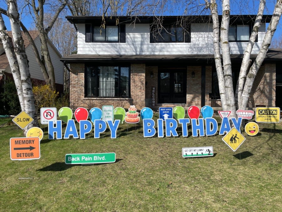If you want a different saying on the lawn, just let us know. We can customize it how you want! Includes the Blue 2' foot letters, balloons, and a number of over the hill themed lawn signs! As with any Yard Greeting, we can add the person's name on the lawn too!