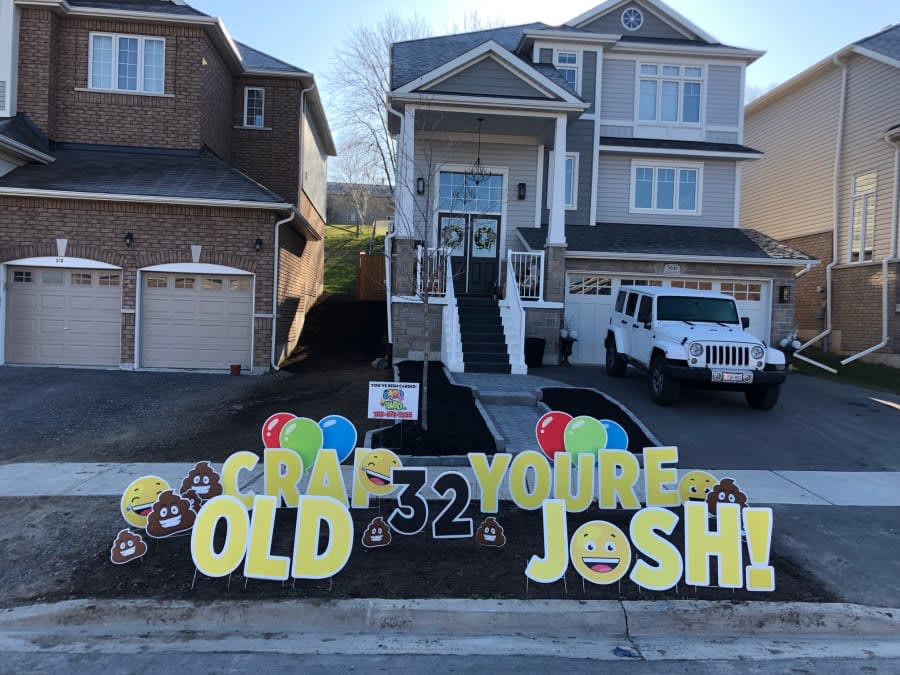 Includes the 2' letters, a variety of smiley poo faces, plastic balloons, and the age. As with any Yard Greeting, we can add the person's name on the lawn too!