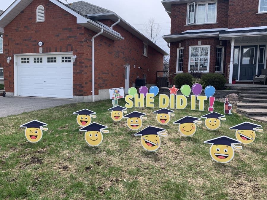 Includes the 2' letters, a variety of graduation smiley faces, and plastic balloons. As with any Yard Greeting, we can add the graduate's name on the lawn as well! (example: "BROOKE MADE IT!" or "CONGRATULATIONS BLAKE!)